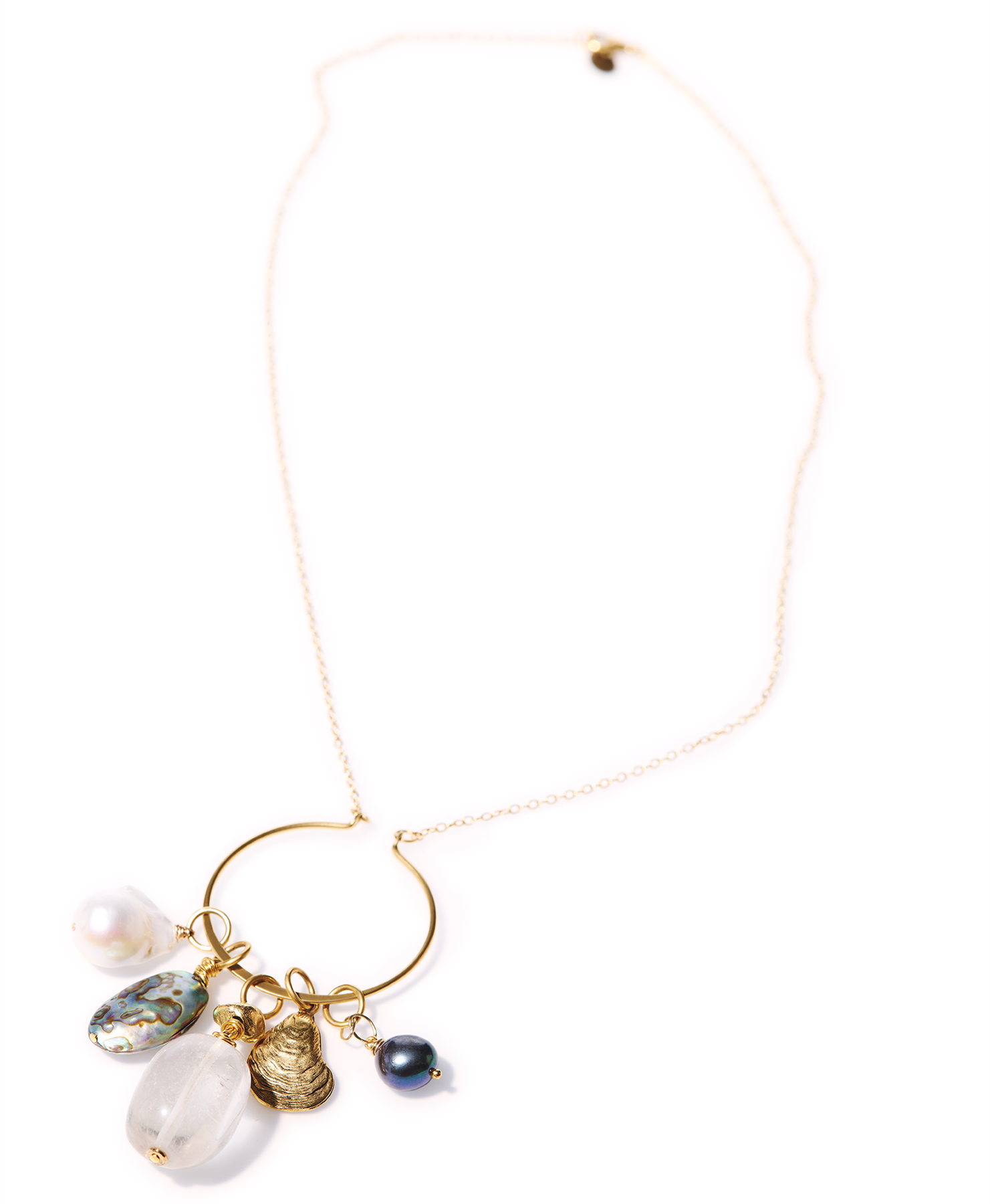 Dark and light pearls dance alongside iridescent abalone, shimmering crystal quartz, and a golden mussel shell— all gracefully suspended from a golden loop, swaying freely from a delicate plated gold chain.