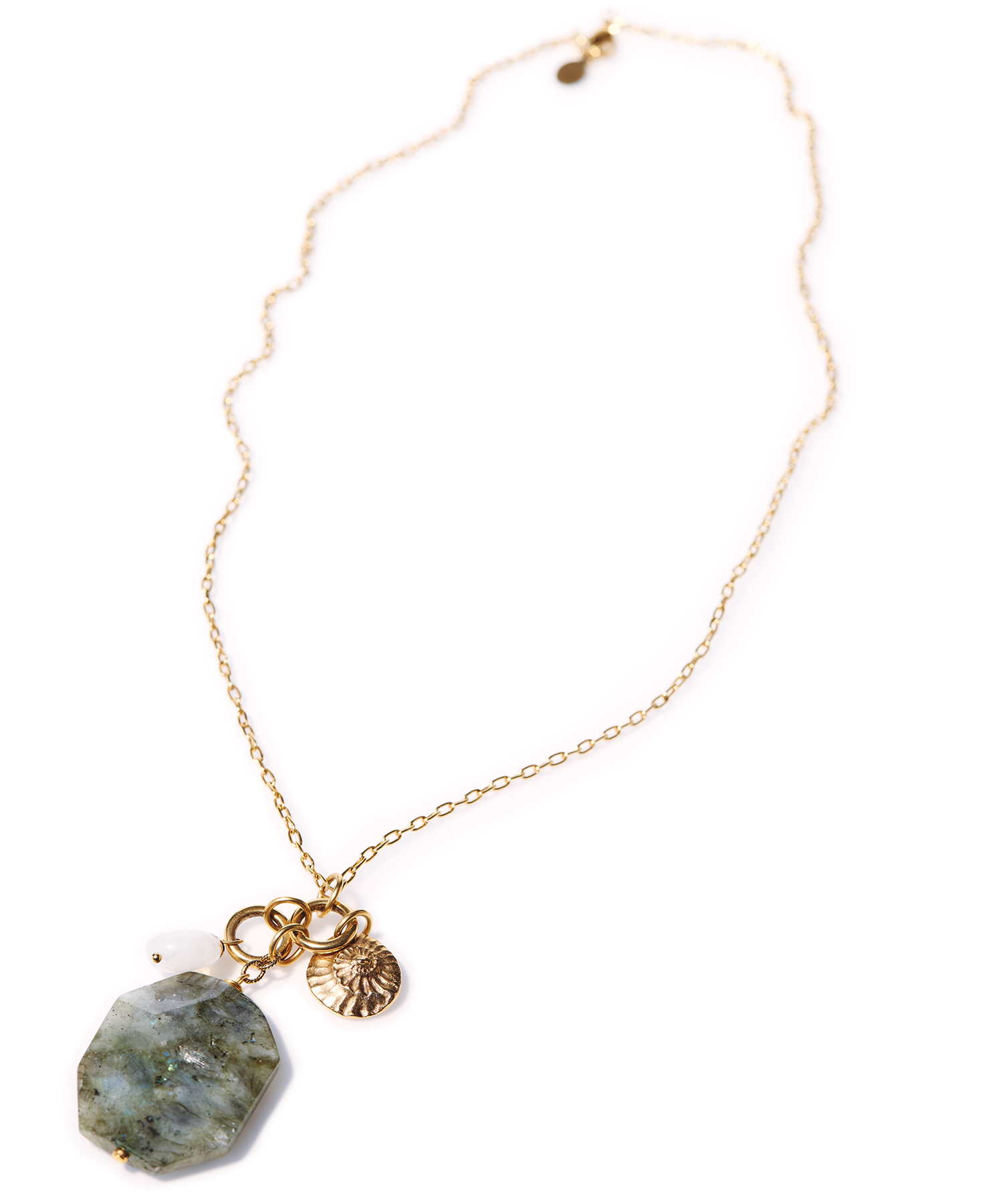 A substantial specimen of enchanting labradorite takes center stage, beautifully complemented by a luminous white emerald and adorned with a delicate golden seashell accent. Gracefully suspended by two golden loops on tiny plated gold chain.