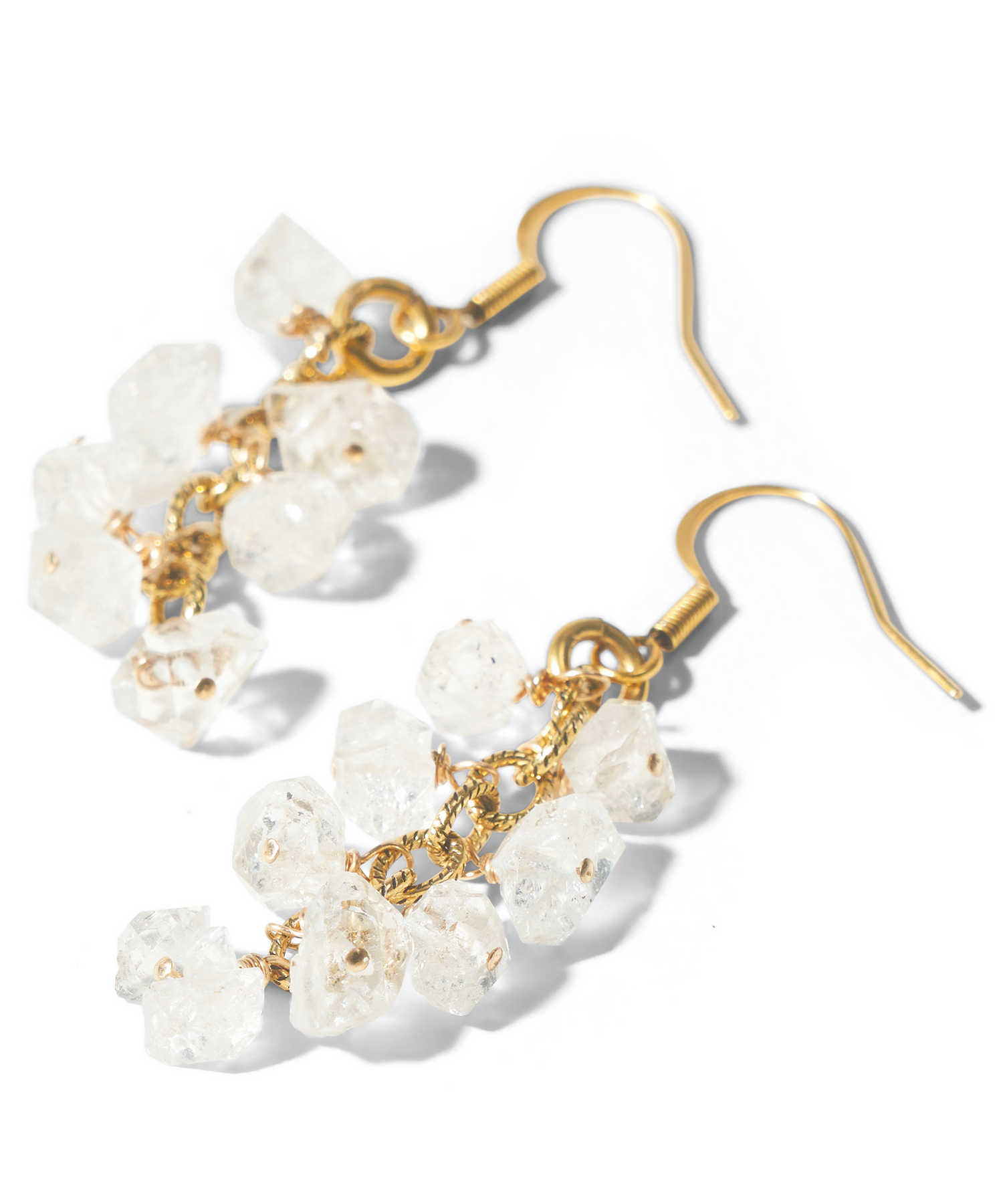 Delicate clusters of natural Herkimer diamonds descend on a simple, golden chain. These crystal quartz-based diamonds, named after their Herkimer, NY discovery site, are said to be the most powerful attunement stone. They correspond to crown and third eye chakras, allowing the wearer to have a greater universal understanding of the self. Hand-crafted, one-of-a-kind earrings are 24k gold-plated, warm to the touch. Length is one and a half inches.