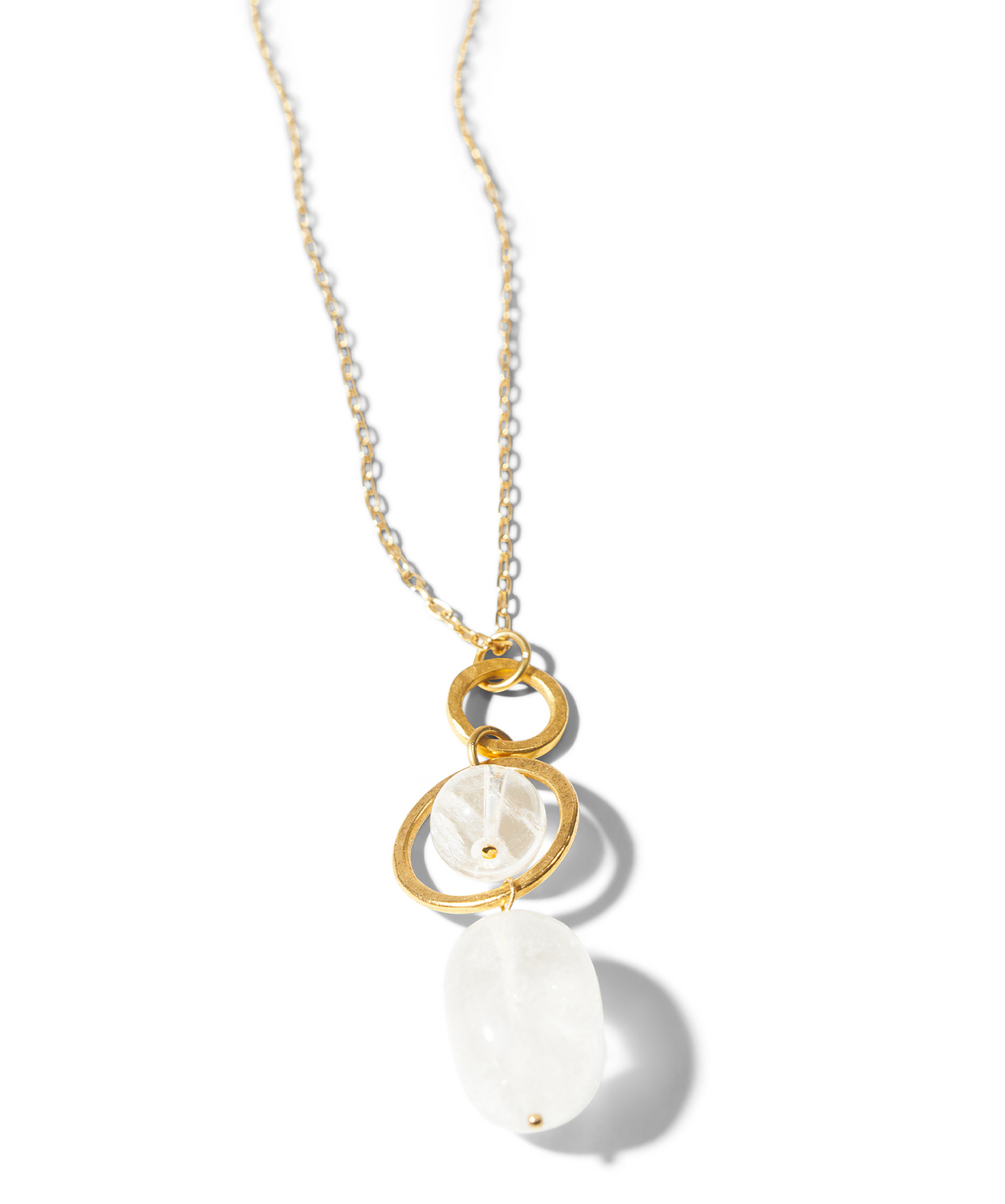 Two golden circles suspend dazzling crystal quartz, like an echo, on this understated necklace. Powerful crystal quartz has been sought throughout time, as it is believed to amplify anything with which it is paired. It corresponds to all chakras, but is thought to be particularly powerful for the crown chakra. Hand-crafted, one-of-a-kind necklace features a lobster clasp and is 24k gold-plated, warm to the touch. Chain is twenty four inches in length, with a two and a half inch drop, and is finished with a lobster clasp.