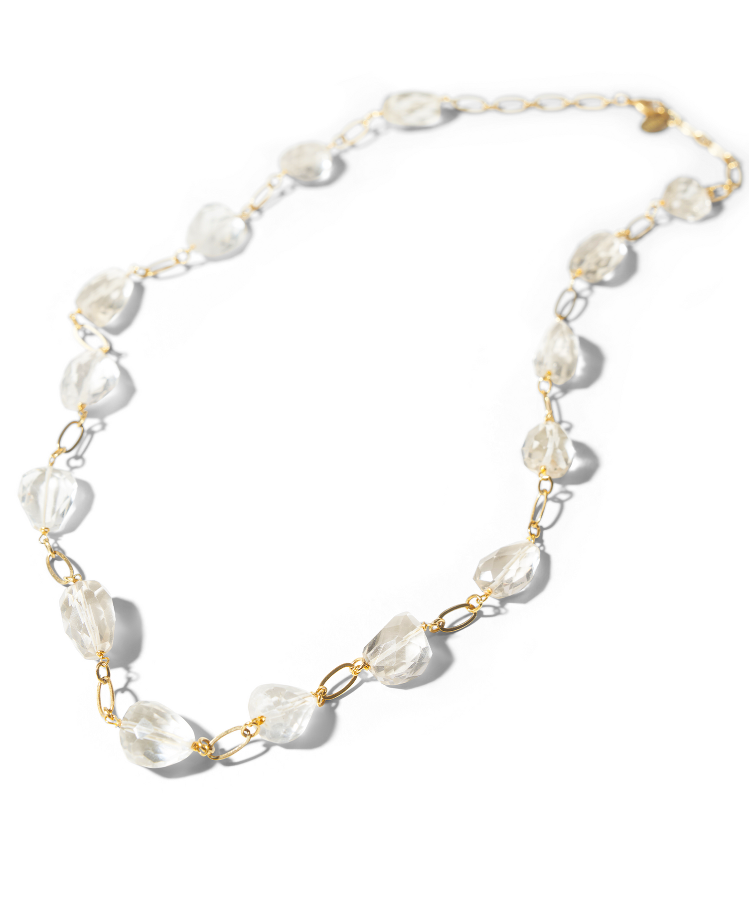 Lovely, irregular crystal quartz stones play among loose, golden loops. Powerful crystal quartz has been sought throughout time, as it is believed to amplify anything with which it is paired. It corresponds to all chakras, but is thought to be particularly powerful for the crown chakra. Hand-crafted, one-of-a-kind necklace is 24k gold-plated, warm to the touch. Chain is twenty four to twenty five inches, finished with a lobster clasp.