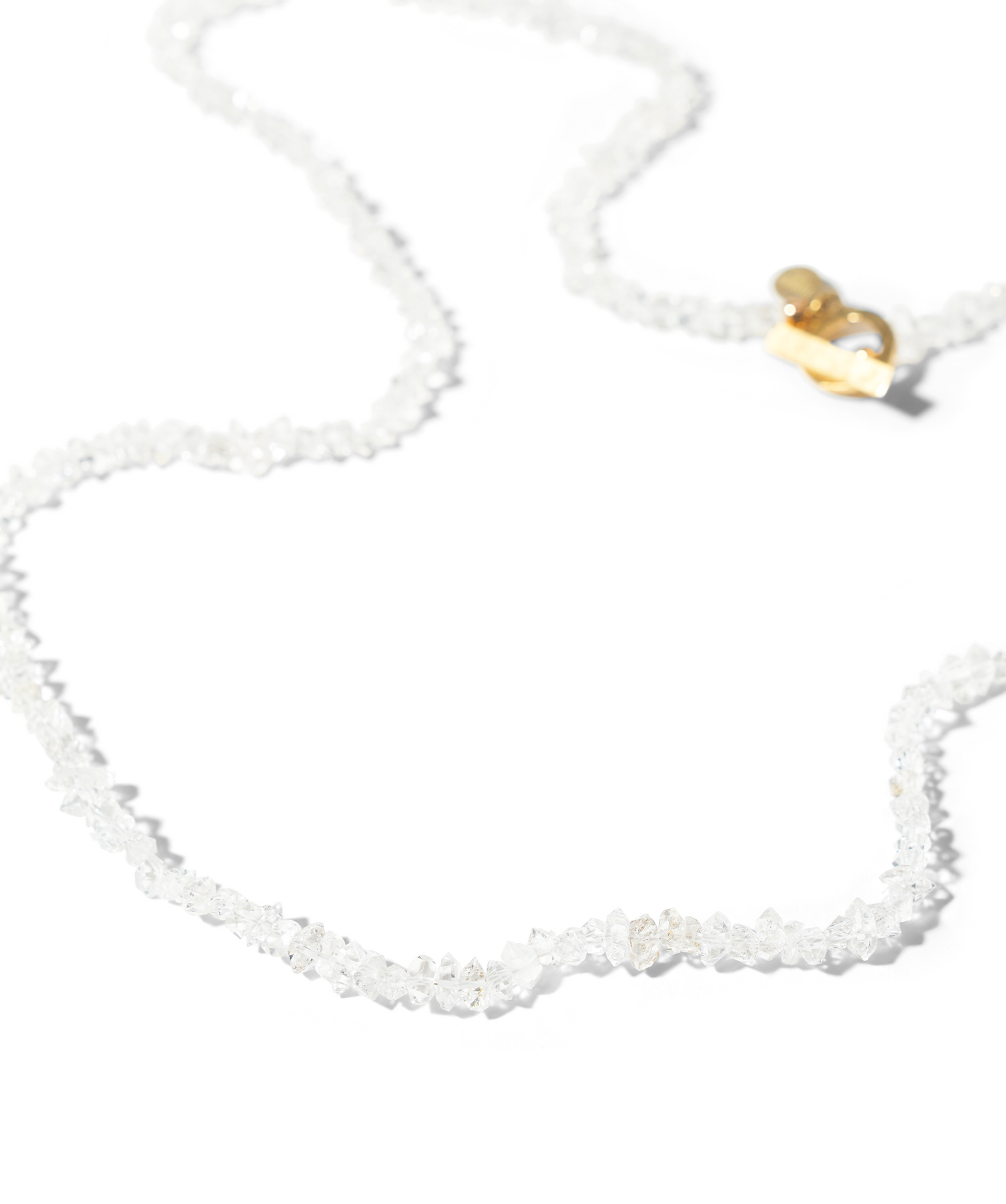 An abundance of Herkimer diamonds gather along an unseen chain to dazzle and shine. These crystal quartz-based diamonds, named after their Herkimer, NY discovery site, are said to be the most powerful attunement stone. They correspond to crown and third eye chakras, allowing the wearer to have a greater universal understanding of the self. Hand-crafted, one-of-a-kind necklace is 24k gold-plated, warm to the touch. Fully-beaded chain is twenty five inches, finished with a toggle clasp.