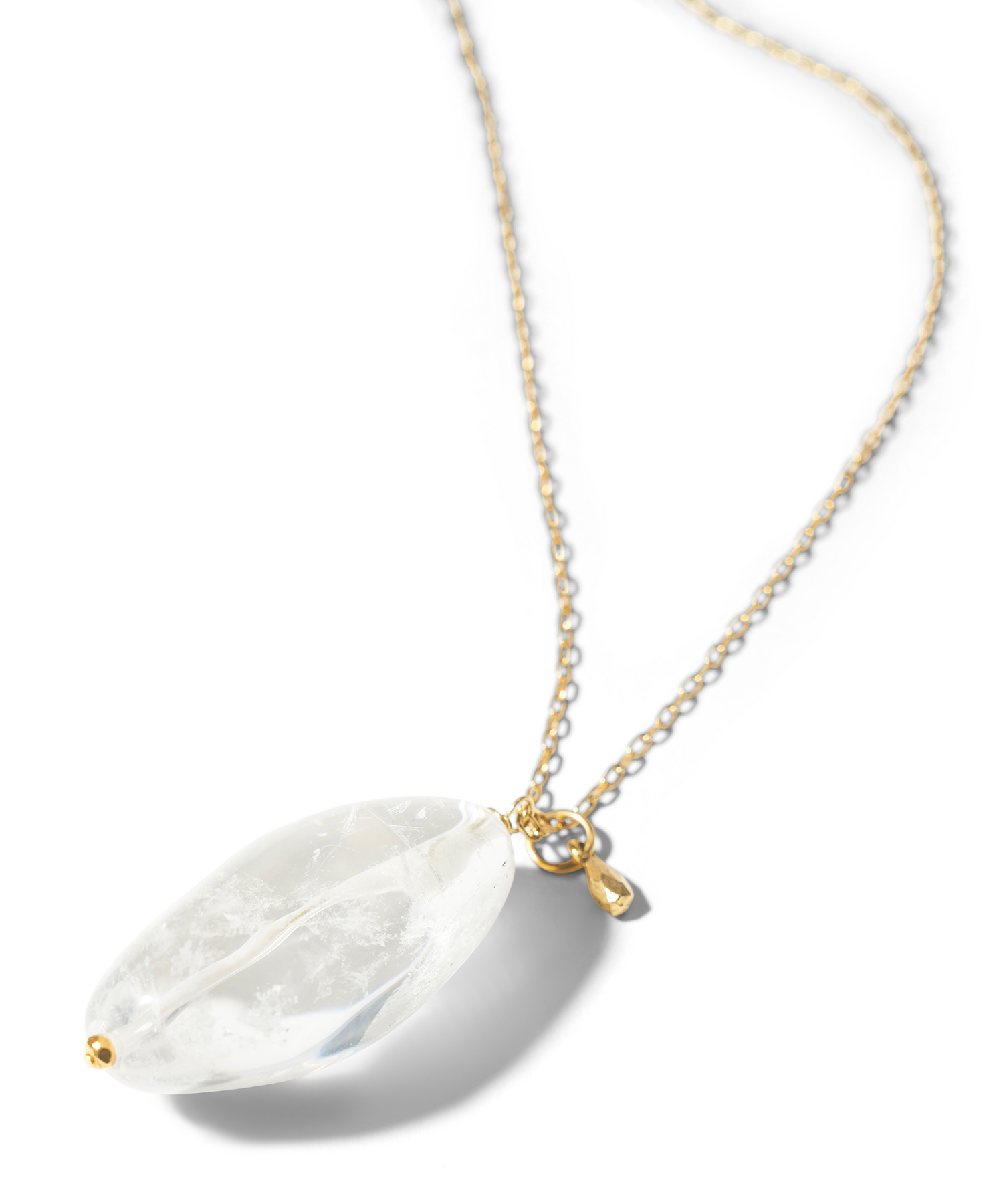 A single, gorgeous, elongated orb of polished crystal quartz graces a simple chain, with nothing to get in the way of its pure beauty. Powerful crystal quartz has been sought throughout time, as it is believed to amplify anything with which it is paired. It corresponds to all chakras, but is thought to be particularly powerful for the crown chakra. Hand-crafted, one-of-a-kind necklace is 24k gold-plated, warm to the touch. Chain is twenty inches with a two inch drop, finished with a lobster clasp.
